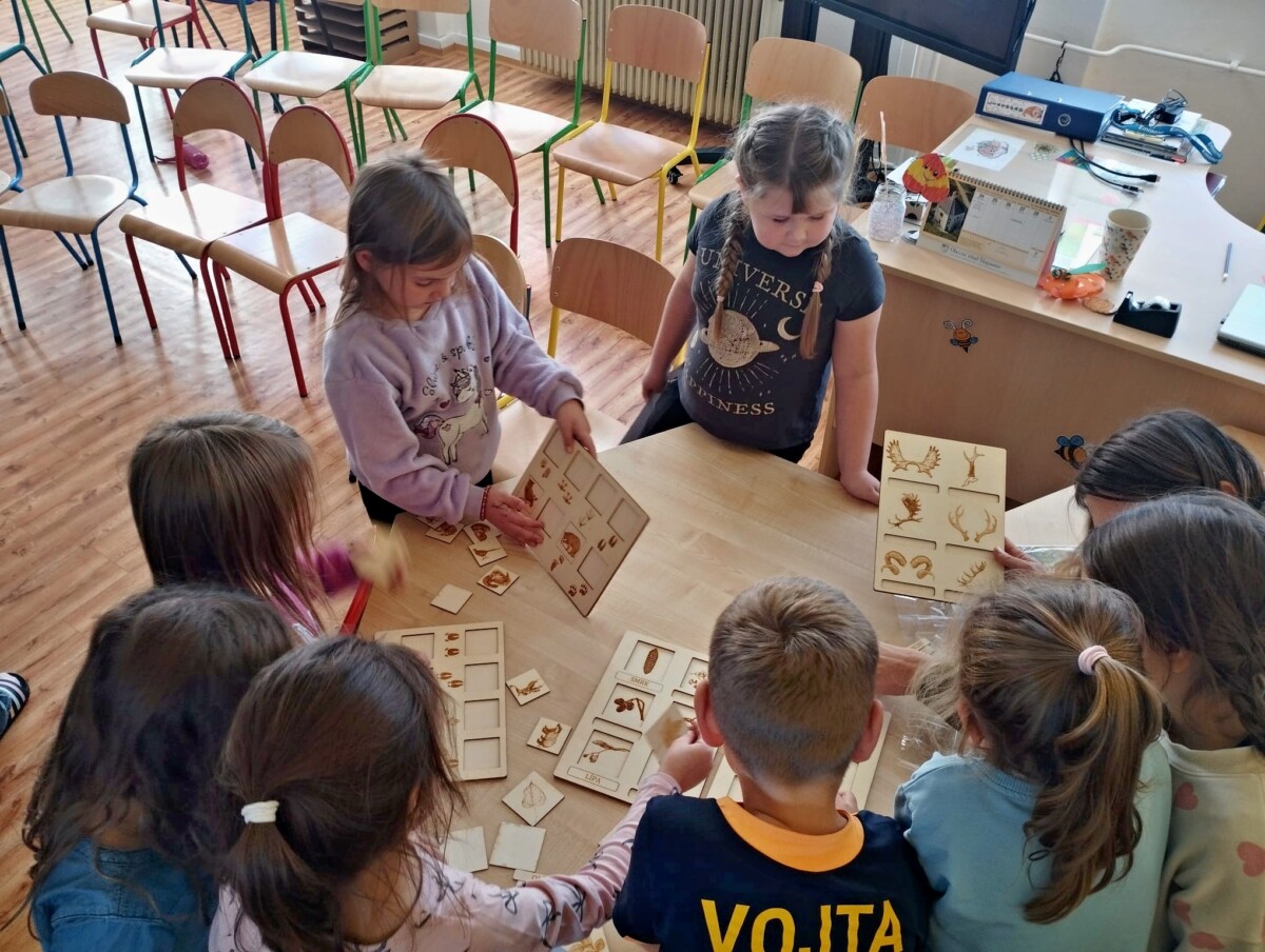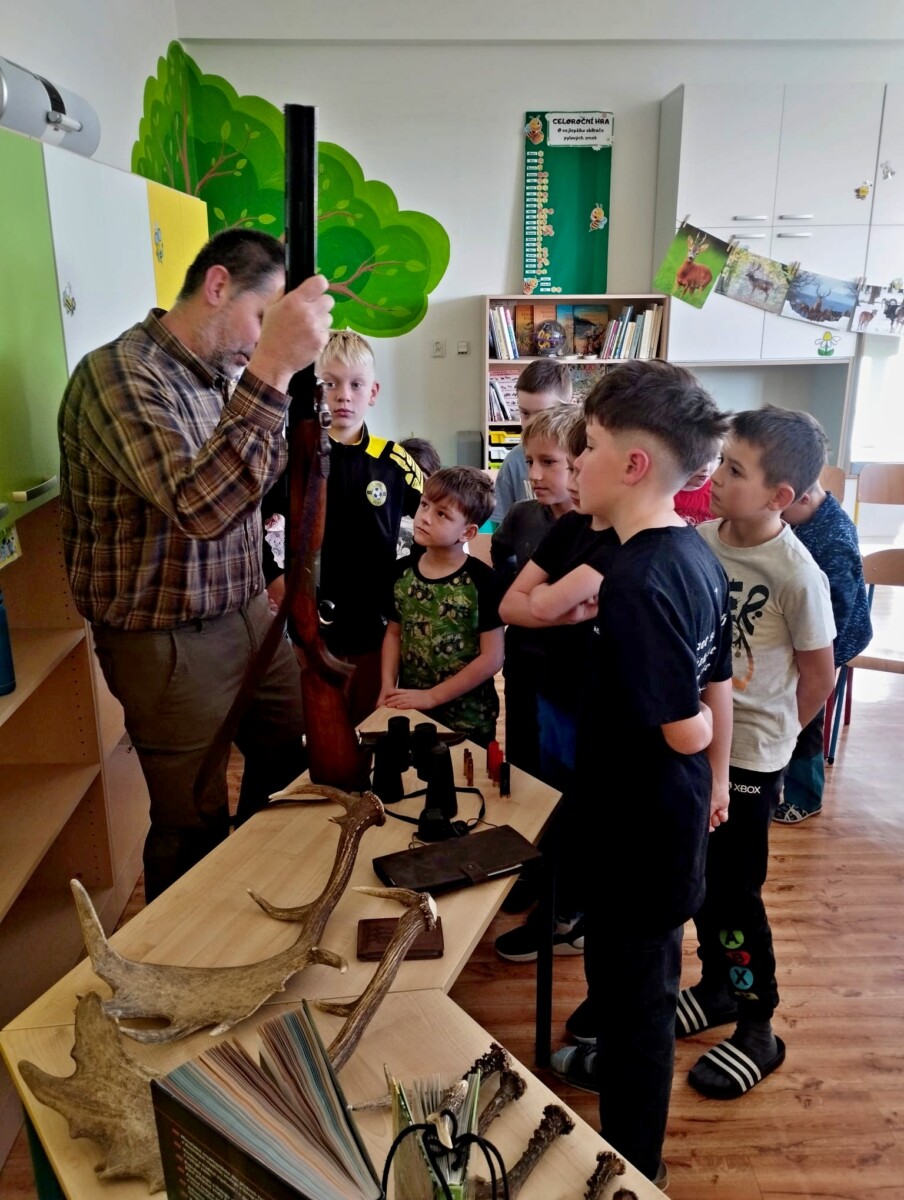 Děkujeme členům Mysliveckého spolku Šlapanov - paní Jiřině Moravcové a panu Josefu Augustinovi za výbornou prezentaci o práci myslivců a myslivosti a o přírodě a zvěři v ní žijící. Oba dokázali upoutat pozornost malých posluchačů družiny Základní a mateřské školy Šlapanov a čelili i záludným otázkám.
