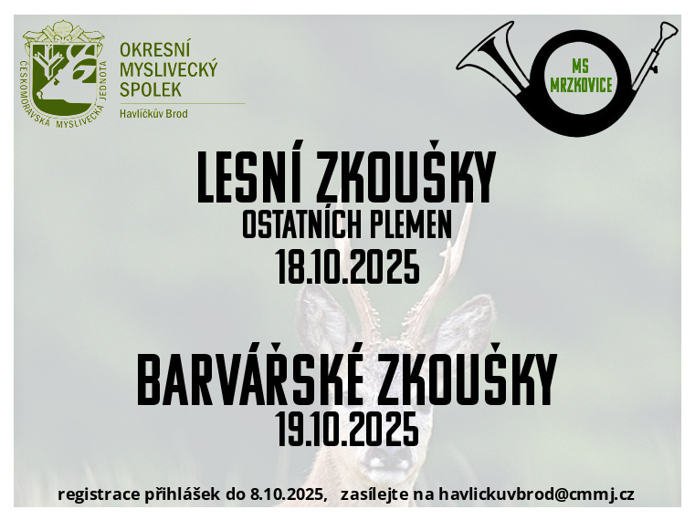 Zveme příznivce lovecké kynologie na víkend v krásné přírodě v okolí Světlé nad Sázavou. Ve spolupráci s Mysliveckým spolkem Mrzkovice pořádáme v sobotu 18.10.2025 lesní zkoušky ostatních plemen a v neděli 19.10.2025 pak barvářské zkoušky. Zahájení plánujeme na osmou hodinu ranní, sraz všech účastníků v Mrzkovicích č. 78.
