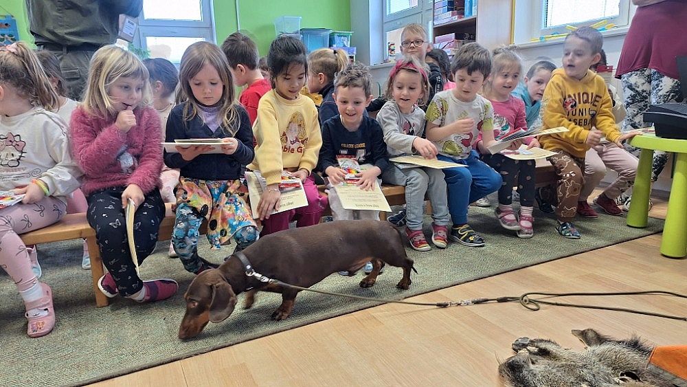 S kolegou jsme letos v druhé části besedy otevřeli i kynologické okénko tím, že jsme dětem předvedli naše psy – Německého křepeláka a hladkosrstého jezevčíka. Trofeje, preparáty a jiné myslivecké pomůcky jsou rázem ty tam, a děti se okamžitě věnovaly a všechnu pozornost nasměrovaly pejskům.